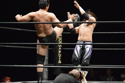 リングに戻った佐々木がKUDOとロープワーク、KUDOリープフロッグ、佐々木ドロップキック(左写真)。