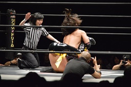 KUDOは佐々木の串刺しドロップキックをかわしコーナーに逆さ吊りに。佐々木起き上がってコーナーに上り雪崩式ブレーンバスター狙う、樋口が後ろから捕まえて裏摩周に(右写真)。10分経過。