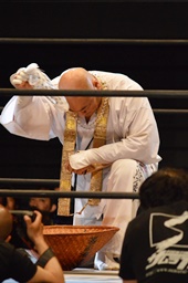 新崎「ディーノ、あの入場のときに持ってった杖はなんだよ?ホウキか?実はな、俺の故郷の四国の八十八番の住職さんたちから、たくさんクレームが来てるんだ。ぜひ、今回名古屋に行って、ディーノさんにやめるよう説得してくれないかって。ディーノ、やめてくれないか?」(右写真)