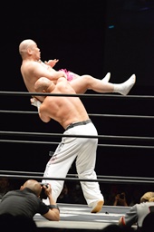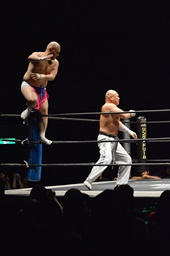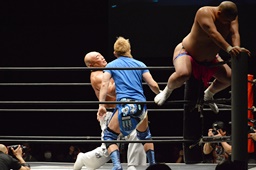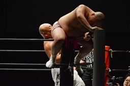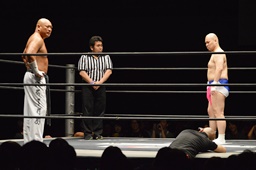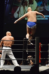 ダイブして脳天チョップ(右写真)、男色ブロック。