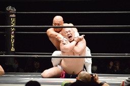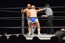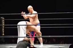 新崎ボディスラム、カウント2。スリーパー(左写真)からストラングルホールド、男色ロープ。5分経過。