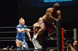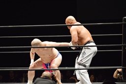 ロックアップ、新崎ヘッドロック、男色ロープに振る、新崎ショルダーブロック(右写真)。