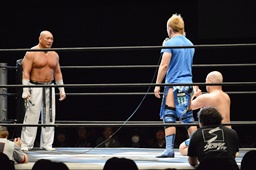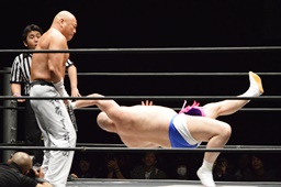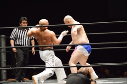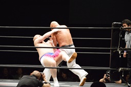新崎チョップ、男色ブロックして(左写真)腕を取る、