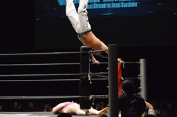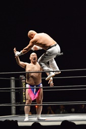 男色ロープからダイブ、新崎地獄突きで迎撃(右写真)。