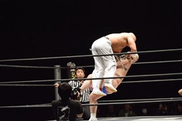 新崎ボディスラムからリバーススプラッシュ(右写真)。