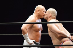 新崎ノド輪落とし狙う、男色ブロックしてキスを狙う(左写真)、
