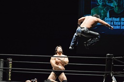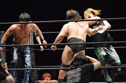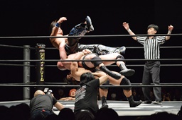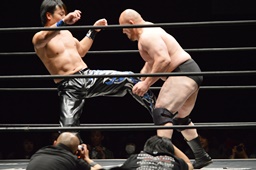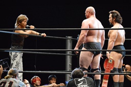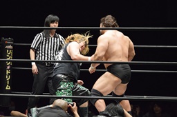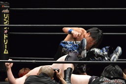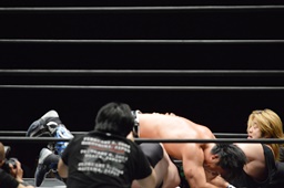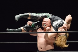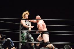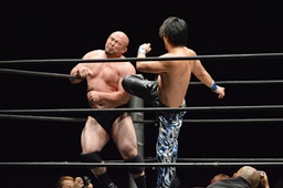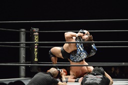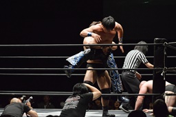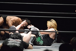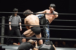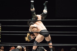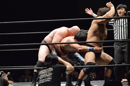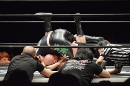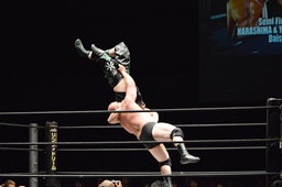 岡林切り返してヘッドロックからフライングメイヤー、HARASHIMAヘッドシザーズ(右写真)、岡林首を抜く。両軍タッチ。