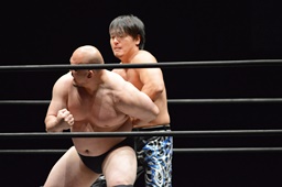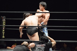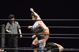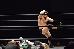 関本ウラノにチョップ、ガットショット、ダウンするとストンピング。首投げからエルボードロップ(左写真)、カウント1。岡林にタッチ。