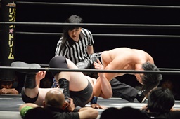 片逆エビ固め(右写真)、HARASHIMAがキックでカット。ウラノはHARASHIMAにタッチ。