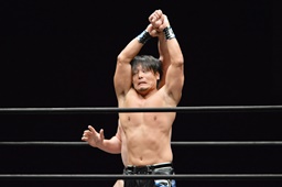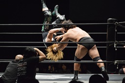王者組はクイックタッチでウラノにボディスラム連発(右写真)。ウラノは場外にエスケープ。岡林追いかけて場外でガットショット、鉄柱前にウラノを立たせてラリアット、ウラノかわして鉄柱に誤爆。ウラノ岡林をリングに戻し腕にエルボー、HARASHIMAにタッチ。5分経過。