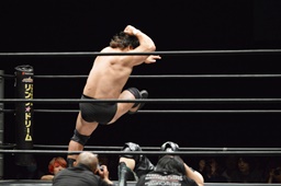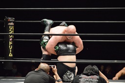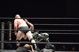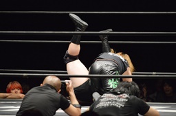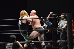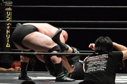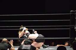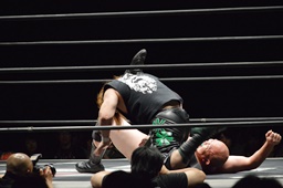 HARASHIMAコーナーに振って串刺しビッグブーツ、コーナーに上げて雪崩式ブレーンバスター(右写真)、カウント2。