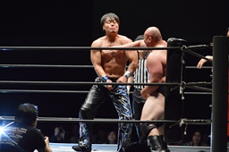 岡林逆水平(左写真)、HARASHIMAミドルキック。ウラノにタッチ。ウラノ腕にエルボースタッブ、岡林逆水平、ウラノキャッチしてワキ固め、リリースしてレッグドロップ、HARASHIMAにタッチ。