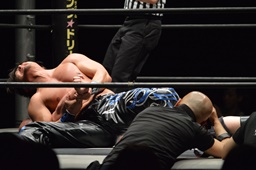 再びミドルキックと逆水平の打ち合い、HARASHIMAもワキ固め(右写真)、岡林ロープ。HARASHIMAはウラノにタッチ。