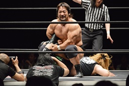 ウラノ腕へのニースタンプ連打(左写真)、カウント2。HARASHIMAにタッチ。