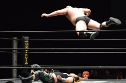 ボディスラムからコーナーに上ってゴーレムスプラッシュ(左写真)、カウント3。