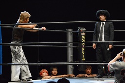 そこにMIKAMI(右写真)。先ほど優勝した鶴見亜門杯の賞品の「GMの権限内で願いが叶えられる」を利用してKO-Dタッグへの挑戦を表明する。
