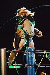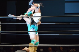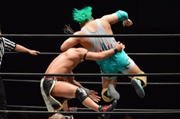 入江雪崩式テディベア狙ってコーナーに上る、彰人立ち上がる(左写真)、