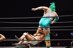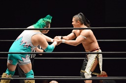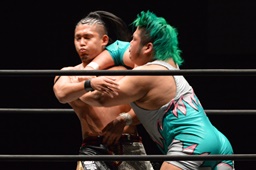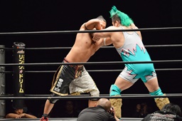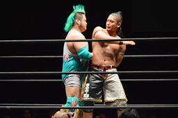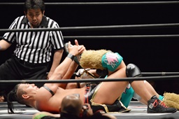 彰人ロープに振る、入江切り返してブラックホールスラム(左写真)、カウント2。