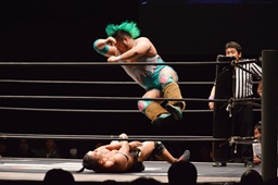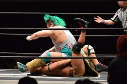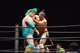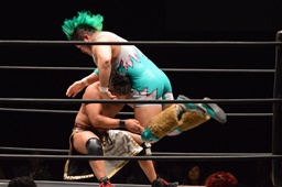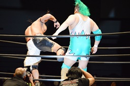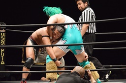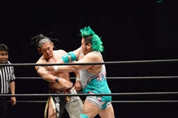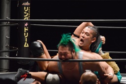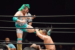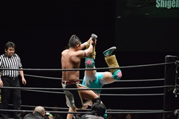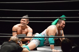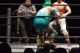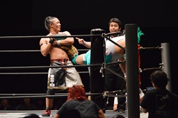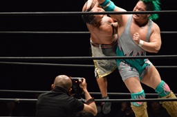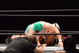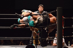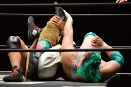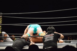 彰人ボディスラム狙う、入江切り返してボディスラム、彰人アンクルホールドに切り返す(右写真)。入江ロープ。