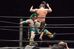 彰人ロープに振ろうとする、入江ブロック、彰人低空ドロップキック、入江ジャンプしてかわし(左写真)、