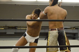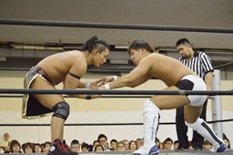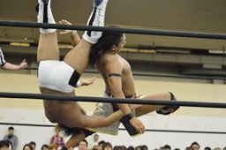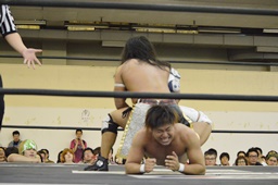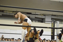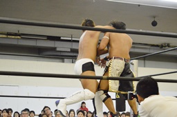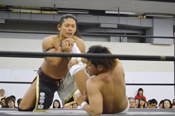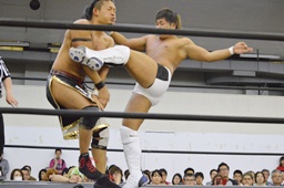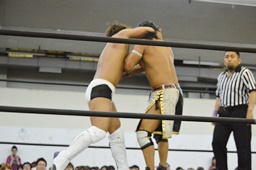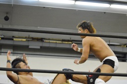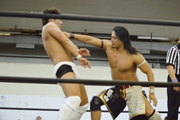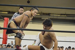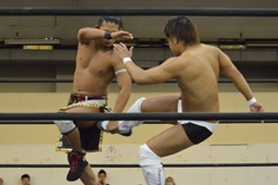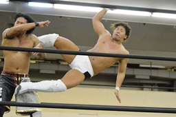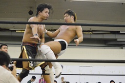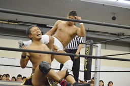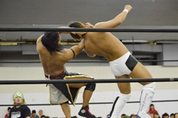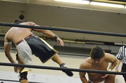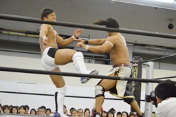 彰人低空ドロップキック(左写真)。彰人ボディスラム、岩崎ブロックして逆に投げる。5分経過。