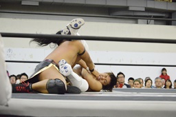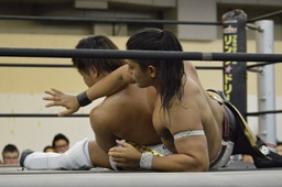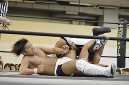 岩崎コーナーに振って突っ込む、彰人回転エビ固めに(右写真)、カウント2。