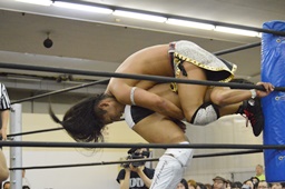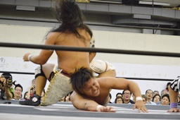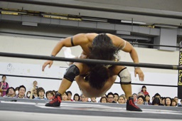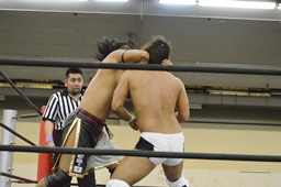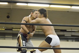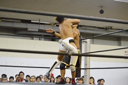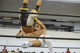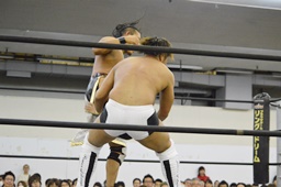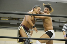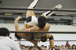 岩崎ダブルアームスープレックス狙うが(右写真)彰人ブロックしてリバース。