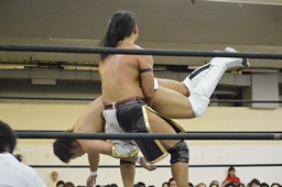 彰人低空ドロップキック、ドラゴンスクリュー、抱え上げて水車落とし(左写真)、カウント2。