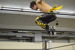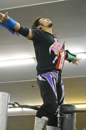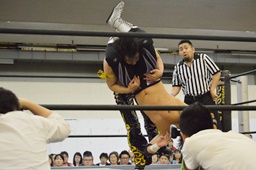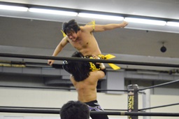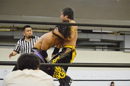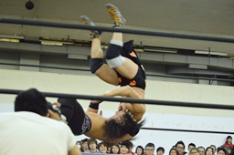 高梨鼻をつまんでチョップ、ロープに飛ぶ、佐々木ケブラドーラ・コン・ヒーロ(左写真)、ボディスラムから背中にエルボードロップ、宮武にタッチ。