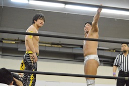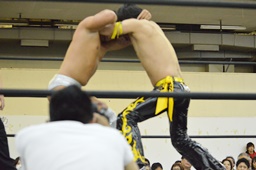 ブレーンバスター(右写真)から片逆エビ固め。KUDOがリングに入ってくると佐々木はリリース、宮武にタッチ。