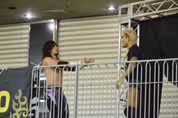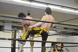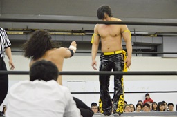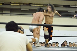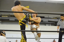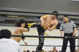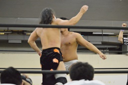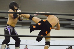 エビに固めるが高梨がカット(右写真)。KUDOは宮武にバックスピンキック。