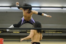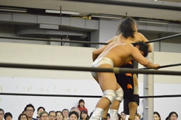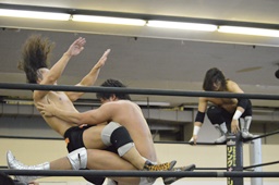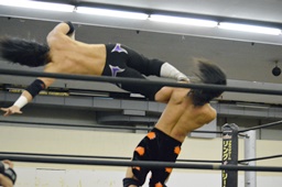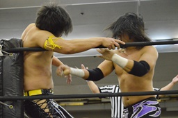 佐々木バックエルボー、ロープに飛ぶ、KUDO入ってダブルロープワークから高梨がネックブリーカードロップ(左写真)、