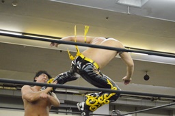高梨パンチ連打(右写真)、ロープに飛ぶ、宮武肩に担いでバックフリップ、佐々木にタッチ。