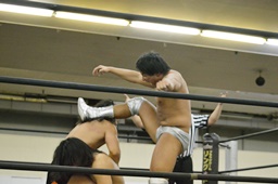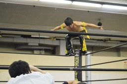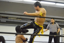 佐々木コーナーに振る、KUDO切り返して8×4、コーナーに上ってダイビングダブルニーアタック(左写真)、カバーは宮武がカット。
