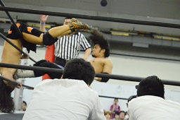 宮武高梨をコーナーに追い込んでショルダーチャージ連発(右写真)。ストンピング、ボディスラム、カウント2。佐々木にタッチ。