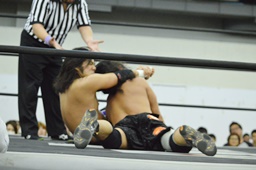 ロープに振る、高梨ブロック、バック取ってエビ固め(右写真)、カウント2。KUDOにタッチ。