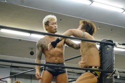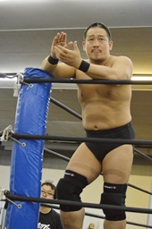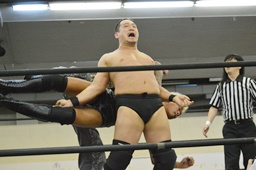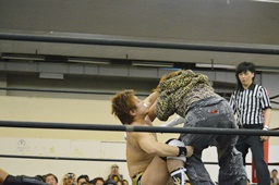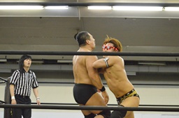 ニラヘッドロック(右写真)、坂口にタッチ。5分経過。