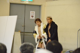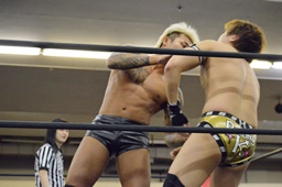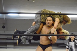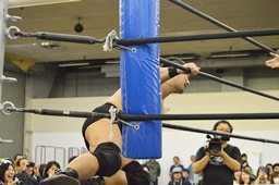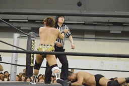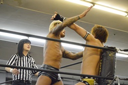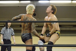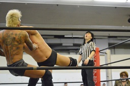 高木ドラゴンリングイン、坂口キック、高木キャッチしてドラゴンスクリュー(左写真)。