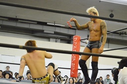 ニラエルボー連打からコーナーに振ってDJタイム(左写真)。