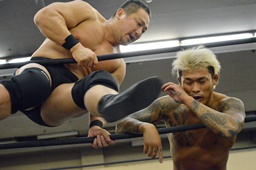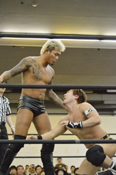 ニラがショルダークロー(右写真)、坂口にタッチ。