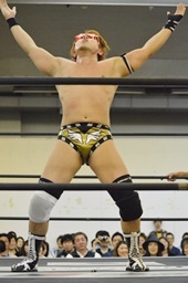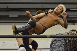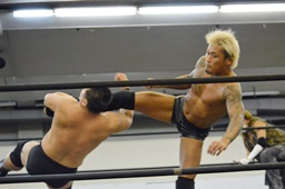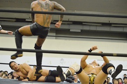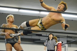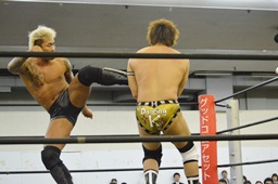 ドロップキック(右写真)、ようやく高木にタッチ。