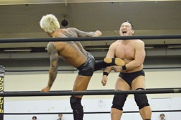 ニラコーナーに振る、高木切り返す。坂口も振ると2人まとめて串刺しラリアット(右写真)、