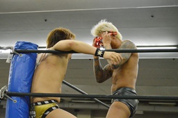 高木ロープに振る、坂口切り返してミドルキック(右写真)、