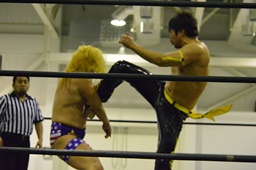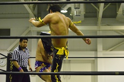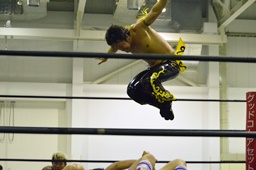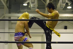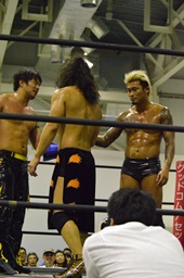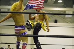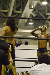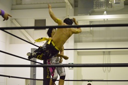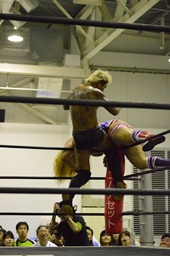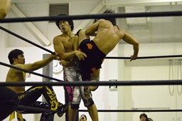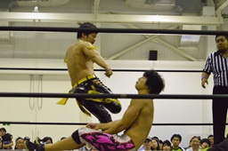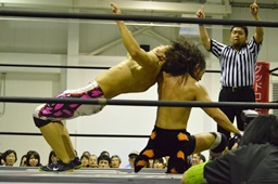 KUDOコーナーに上ってダイビングダブルニーアタック、竹下がドロップキックで撃墜(右写真)。
