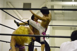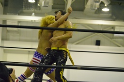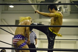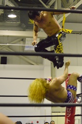 KUDO再度コーナーに上ってダイビングダブルニードロップ(左写真)、カウント3。