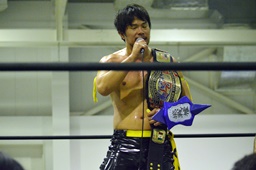 KUDO「完勝です。僕はこのままこのベルトを両国国技館まで守り続けます。そして僕の仲間がKO-Dトーナメントを勝ち抜いてくれることを願っています。そして両国国技館のメインでこのベルトを懸けて酒呑童子対決を必ず実現させます!今日もたくさんのご来場誠にありがとうございます。富士と言えば富士山ですね。日本一の富士山の麓で飲むお酒は日本一の味だと思います。また自分がチャンピオンとしてこの富士に帰ってきます!いくぞー!酒盛りだー!」(右写真)