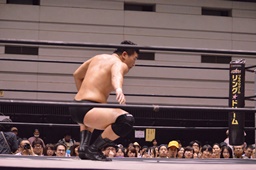 ぶちかましを狙うが入江はカウンターのスピアー(左写真)、カウント2。15分経過。