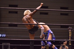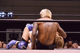 坂口ヒザ蹴り、ミドルキック、PKはかわして大石ヘッドロック、坂口コーナーに乗せる(左写真)。
