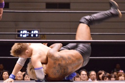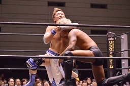 大石ヘッドロックからフライングメイヤー(右写真)、坂口ヘッドシザーズ。
