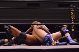 大石リングに戻るとフェースロックからヘッドロック(右写真)、フライングメイヤー。5分経過。